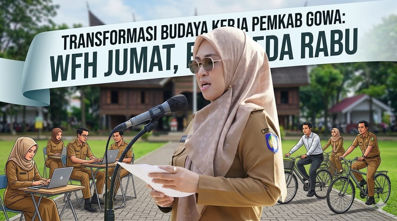 GOWA | POROSRAKYATNEWS.ID – Pemerintah Kabupaten Gowa, Sulawesi Selatan, resmi melakukan terobosan dalam sistem kerja Aparatur Sipil Negara (ASN). Mulai April 2026, Pemkab Gowa memberlakukan sistem kerja dari rumah atau Work From Home (WFH) setiap hari Jumat dan mewajibkan penggunaan sepeda atau motor setiap hari Rabu. Kebijakan ini tertuang dalam Surat Edaran Bupati Gowa, Sitti...