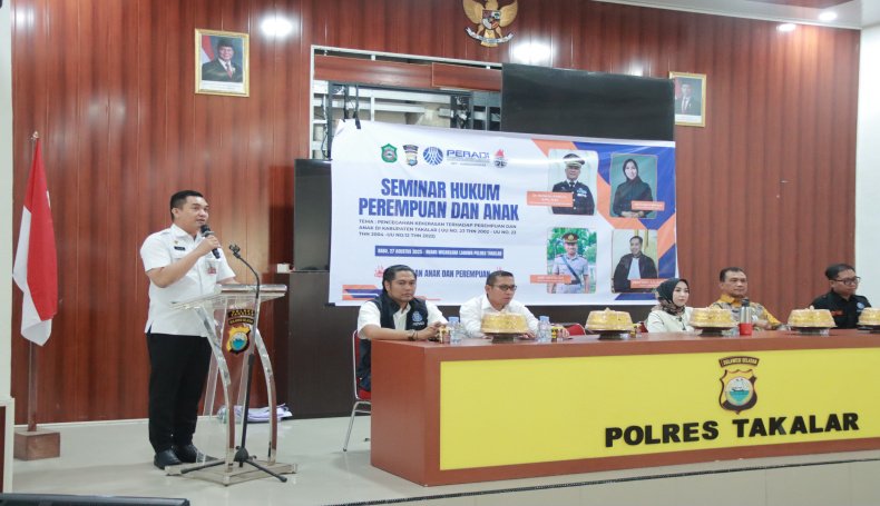 Penabuhan Gendang oleh Sekda Takalar sebagai tanda dibukanya seminar tersebut dengan Narasumber yang hadir di antaranya Dr. Surianto, A.Md.I.P., S.Pd., M.M (Kepala Balai Pemasyarakatan Kelas I Makassar), AKP Hatta, S.H (Kasat Reskrim Polres Takalar), Abdul Gaffar, S.H., M.I.Kom (Advokat/Praktisi Hukum), serta Hj. Fadilah Fahriana Hengky yang juga menjabat Ketua DPW Perempuan Bangsa PKB Sulawesi Selatan sekaligus Ketua Bidang 1 TP PKK Kabupaten Takalar di Aula Pertemuan Polres Takalar, Rabu (27/8/2025).