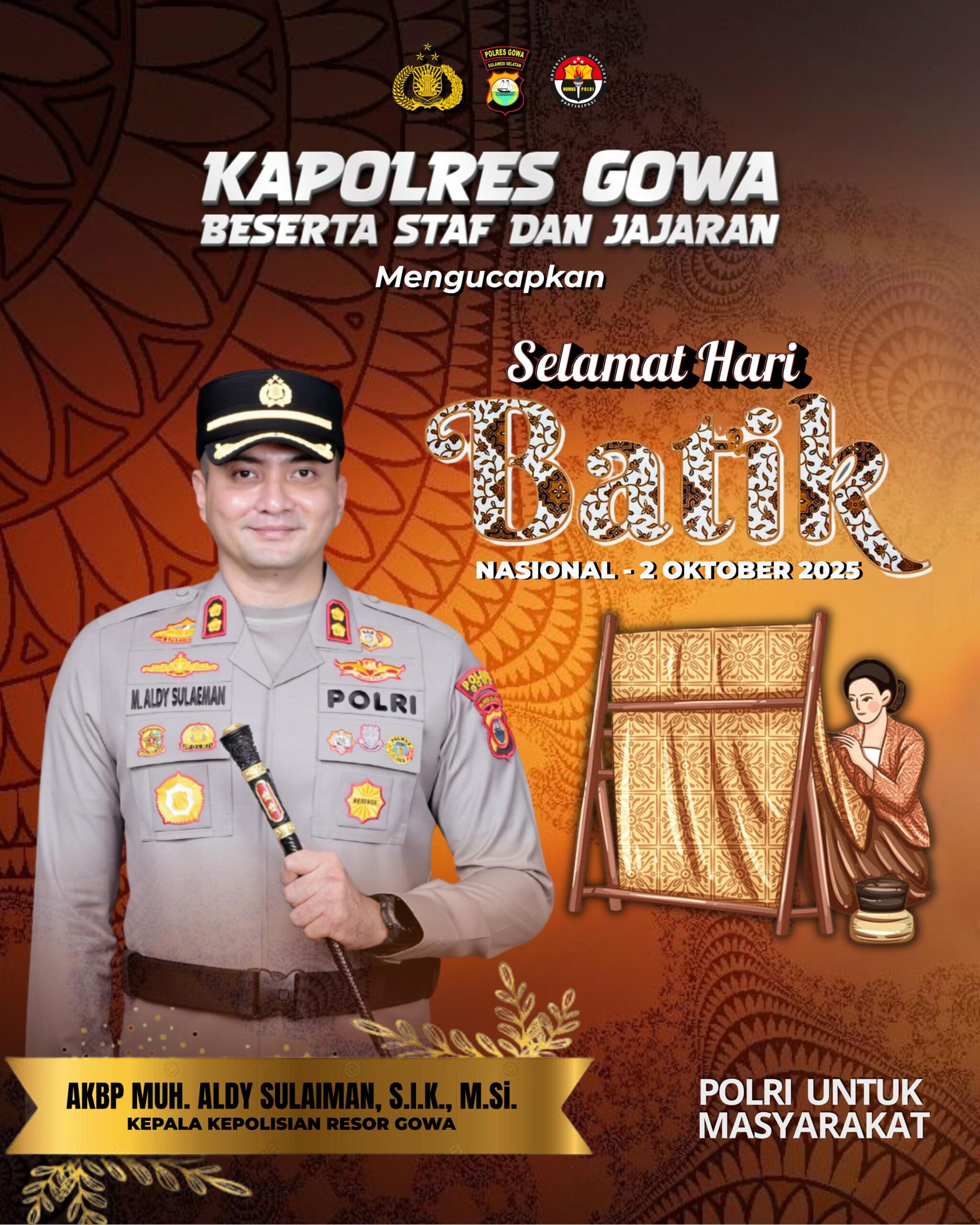 ɢᴏᴡᴀ | ᴘᴏʀᴏsʀᴀᴋʏᴀᴛɴᴇᴡs.ɪᴅ – Kapolres Gowa AKBP Muhammad Aldy Sulaiman, S.I.K., M.Si., beserta seluruh staf dan jajaran Polres Gowa menyampaikan ucapan Selamat Hari Batik Nasional kepada seluruh masyarakat Indonesia, Kamis (2/10/2025).